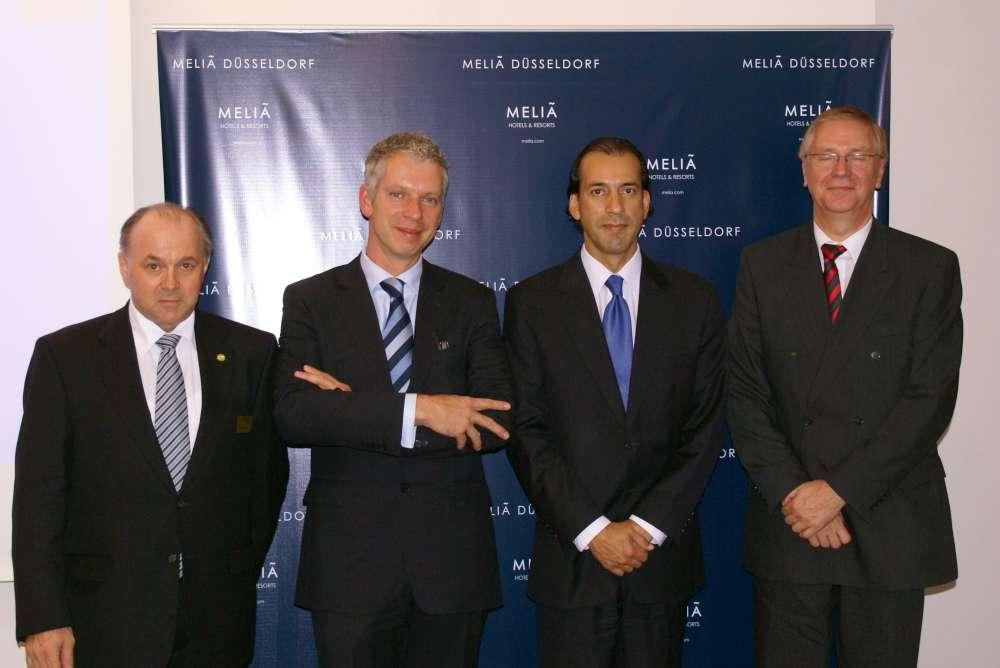 Foto: Carstino Delmonte / Archiv: Markus Steiner (Hoteldirektor Melia Düsseldorf), Markus Vergin (Hoteldirektor des neuen Innside Düsseldorf Hafen, und das spanische Management der Hotelgruppe (v.l.n.r.)
