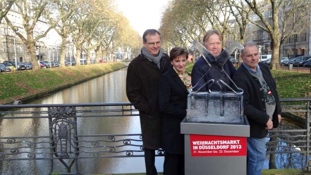 Foto: Carstino Delmonte/ V.l.n.r.: Dr. Eva-Maria Illigen-Günther (Geschäftsführerin Düsseldorf Marketing & Tourismus GmbH), Titus Jacobs (Betreiber Eislaufbahn), Oscar Bruch jr. (Betreiber „Wheel of Vision“ auf dem Burgplatz) und Peter Wienen (Vorsitzender Interessengemeinschaft Königsallee e.V.) mit Radschläger-Eisskulptur.