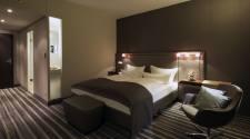 Das Musterzimmer des Steigenberger Airport Hotel Berlin zeigt, wie Gäste in dem Hotel am neuen Flughafen wohnen werden. Warme Farben und dezente Materialien schaffen eine Atmosphäre der Ruhe inmitten des quirligen Flughafens.