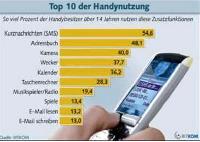 Das beliebteste Handy-Feature ist – nach der Telefonie – die Kurznachricht. Mehr als jeder zweite verschickt SMS mit seinem Mobiltelefon. Dies ergab eine repräsentative Studie der Aris Umfrageforschung im Auftrag des Hightech-Verbands BITKOM.