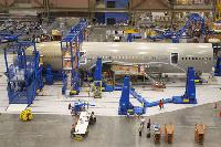 Since the 787 is assembled from these large assemblies rather than many smaller pieces, traditional monument assembly tools are not necessary. Portable tools, designed with ergonomics in mind, move the assemblies into place. No overhead cranes are used to move airplane structure.