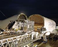 Manufactured by Alenia Aeronautica at its facility in Foggia, Italy, the horizontal stabilizer is transported in five pieces – the left and right stabilizer, two elevators and a center. The shipment configuration measures nine feet wide, 13 feet high and is 42 feet long. It was delivered to Boeing late yesterday via the Dreamlifter, a specially modified 747-400 used to transport 787 major assemblies. The horizontal stabilizer was loaded into position in the 787 final assembly bay earlier today. The completed assembly has a wing span of approximately 62 feet and measures 32 feet fore/aft.