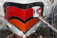 Bild: Aida Cruises: AIDAblu Kussmundbemalung 4.7.2009.jpg“: Tanja Barkau (links) zieht mit Hilfe von Josef Albers der AIDAblu die Lippen nach.