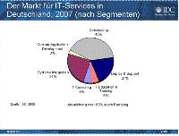 Für 2008 rechnet IDC mit einem Wachstum von 5,1 Prozent gegenüber dem Vorjahr und einem Volumen von fast 38 Mrd. US-Dollar. Bis 2012 erwartet IDC eine durchschnittliche jährliche Wachstumsrate von 5,5 Prozent. Wie in den vergangenen Jahren treiben die großen Segmente Systems Integration und Outsourcing den Markt dynamisch an.